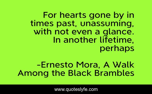 This page presents the quote "For hearts gone by in times past, unassuming, with not even a glance. In another lifetime, perhaps". Author of this quote is Ernesto Mora, A Walk Among the Black Brambles. This quote is about heart, love, affection, time,.