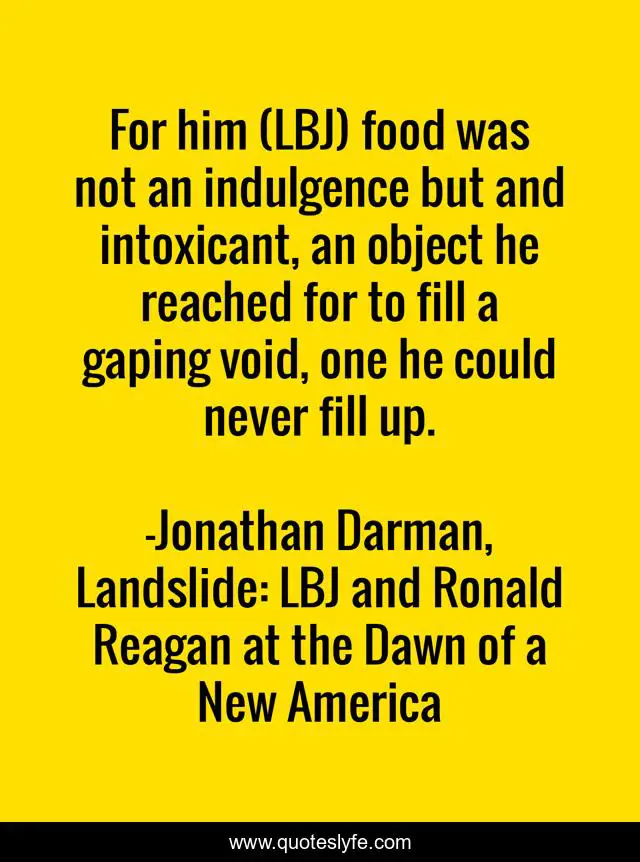 This page presents the quote "For him (LBJ) food was not an indulgence but and intoxicant, an object he reached for to fill a gaping void, one he could never fill up.". Author of this quote is Jonathan Darman, Landslide: LBJ and Ronald Reagan at the Dawn of a New America. This quote is about addiction, appetite, idolatry, flesh,.