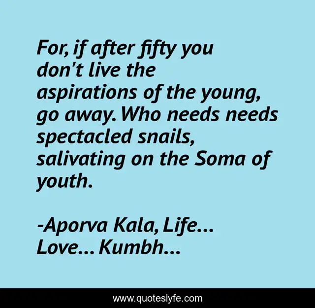 This page presents the quote "For, if after fifty you don't live the aspirations of the young, go away. Who needs needs spectacled snails, salivating on the Soma of youth.". Author of this quote is Aporva Kala, Life... Love... Kumbh.... .