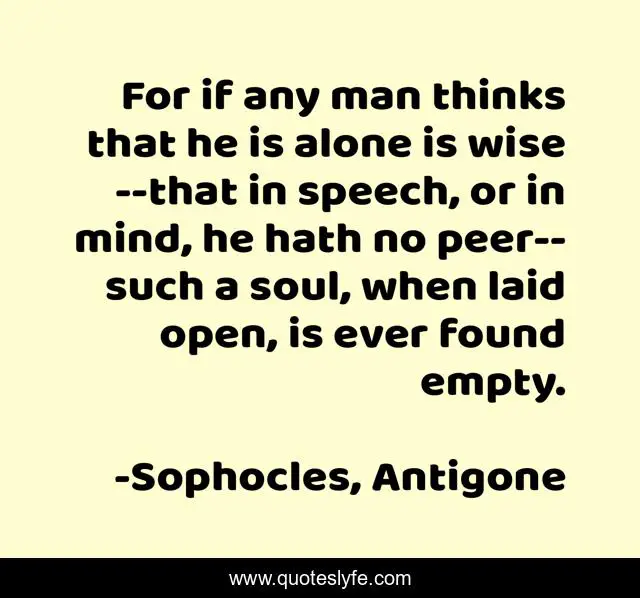 This page presents the quote "For if any man thinks that he is alone is wise--that in speech, or in mind, he hath no peer--such a soul, when laid open, is ever found empty.". Author of this quote is Sophocles, Antigone. This quote is about pride, solipsism, humility,.