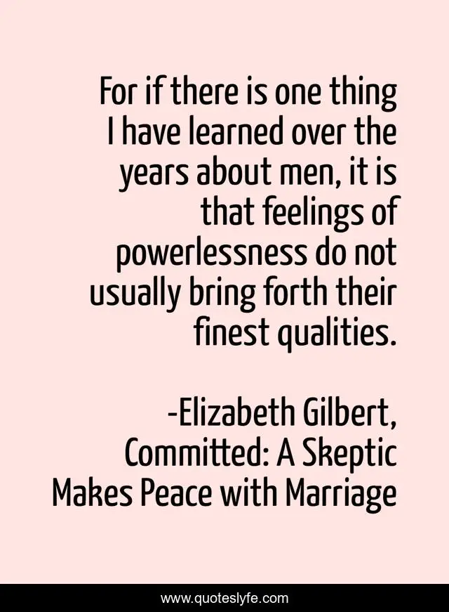 This page presents the quote "For if there is one thing I have learned over the years about men, it is that feelings of powerlessness do not usually bring forth their finest qualities.". Author of this quote is Elizabeth Gilbert, Committed: A Skeptic Makes Peace with Marriage. This quote is about powerlessness, men,.