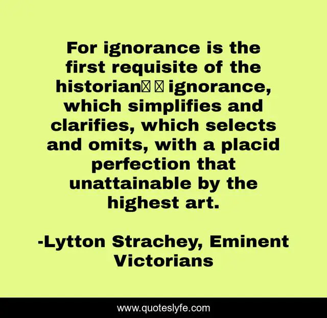 This page presents the quote "For ignorance is the first requisite of the historian──ignorance, which simplifies and clarifies, which selects and omits, with a placid perfection that unattainable by the highest art.". Author of this quote is Lytton Strachey, Eminent Victorians. This quote is about historian, ignorance,.