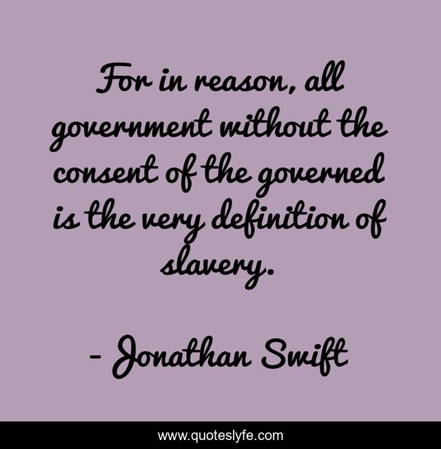 This page presents the quote "For in reason, all government without the consent of the governed is the very definition of slavery.". Author of this quote is Jonathan Swift. This quote is about reason, without, slavery,.