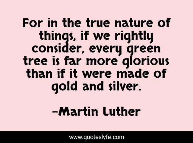 This page presents the quote "For in the true nature of things, if we rightly consider, every green tree is far more glorious than if it were made of gold and silver.". Author of this quote is Martin Luther. This quote is about tree, green, gold,.