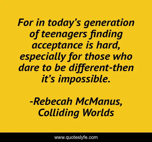 This page presents the quote "For in today’s generation of teenagers finding acceptance is hard, especially for those who dare to be different-then it’s impossible.". Author of this quote is Rebecah McManus, Colliding Worlds. This quote is about be-yourself, bullying, different, school, teenagers,.