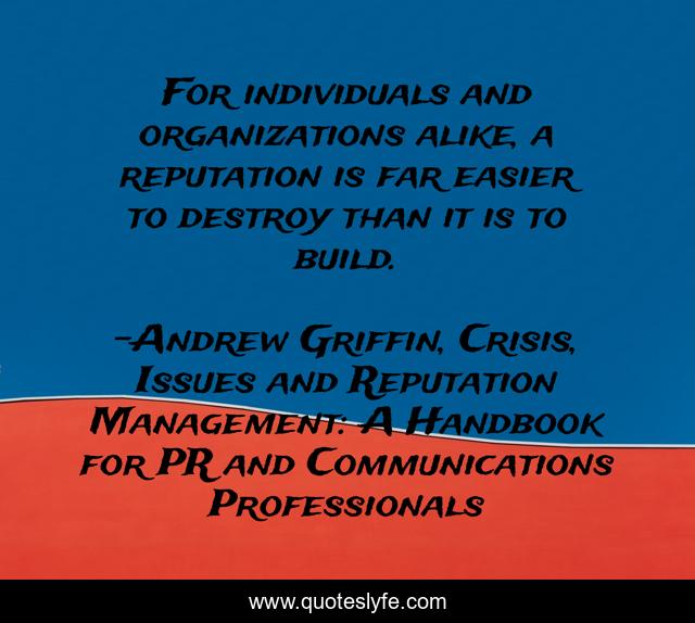 "Andrew Griffin, Crisis, Issues and Reputation Management: A Handbook for PR and Communications Professionals Quotes." Quoteslyfe.com, 2025. Fri. 05 Dec. 2025. <https://www.quoteslyfe.com/quote/For-individuals-and-organizations-alike-a-reputation-128659>.