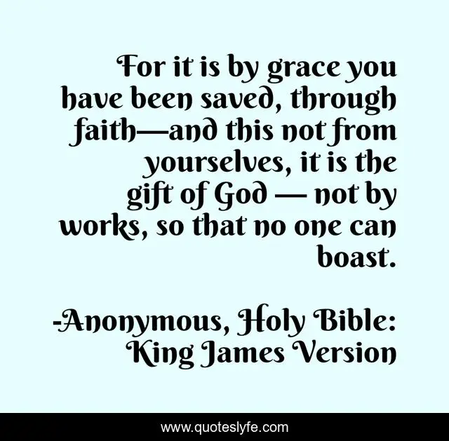 This page presents the quote "For it is by grace you have been saved, through faith—and this not from yourselves, it is the gift of God — not by works, so that no one can boast.". Author of this quote is Anonymous, Holy Bible: King James Version. .