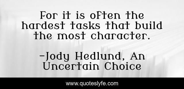 This page presents the quote "For it is often the hardest tasks that build the most character.". Author of this quote is Jody Hedlund, An Uncertain Choice. .