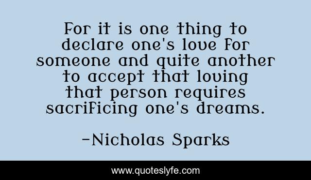 This page presents the quote "For it is one thing to declare one's love for someone and quite another to accept that loving that person requires sacrificing one's dreams.". Author of this quote is Nicholas Sparks. This quote is about life, love, sacrifice, acceptance, the-longest-ride, affection,.