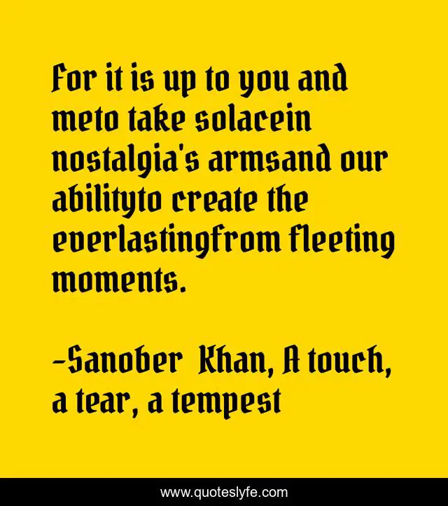 This page presents the quote "For it is up to you and meto take solacein nostalgia's armsand our abilityto create the everlastingfrom fleeting moments.". Author of this quote is Sanober Khan, A touch, a tear, a tempest. This quote is about forever, fleeting, profound, moments, comfort, life, fleeting-life, arms, life-lessons,.