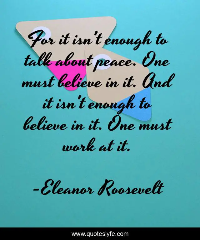This page presents the quote "For it isn't enough to talk about peace. One must believe in it. And it isn't enough to believe in it. One must work at it.". Author of this quote is Eleanor Roosevelt. This quote is about going, getting,.