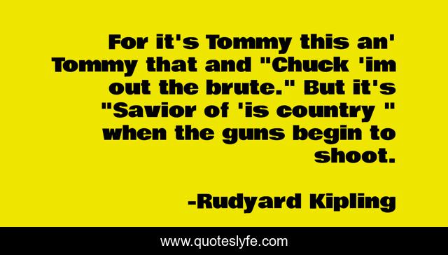 This page presents the quote "For it's Tommy this an' Tommy that and "Chuck 'im out the brute." But it's "Savior of 'is country " when the guns begin to shoot.". Author of this quote is Rudyard Kipling. .
