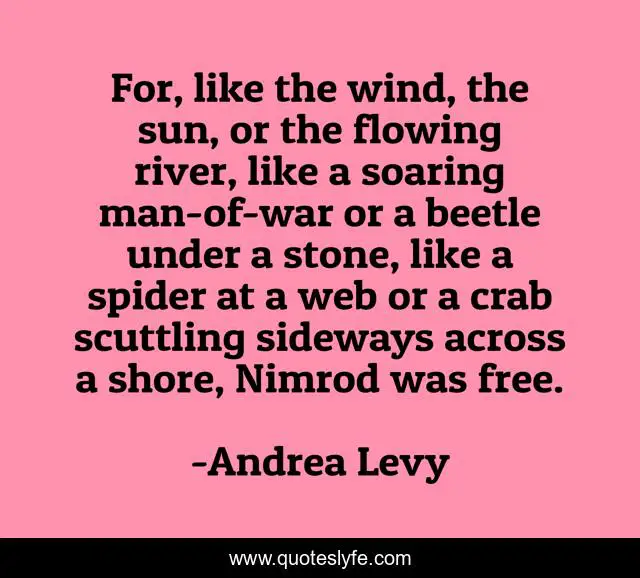 This page presents the quote "For, like the wind, the sun, or the flowing river, like a soaring man-of-war or a beetle under a stone, like a spider at a web or a crab scuttling sideways across a shore, Nimrod was free.". Author of this quote is Andrea Levy. .