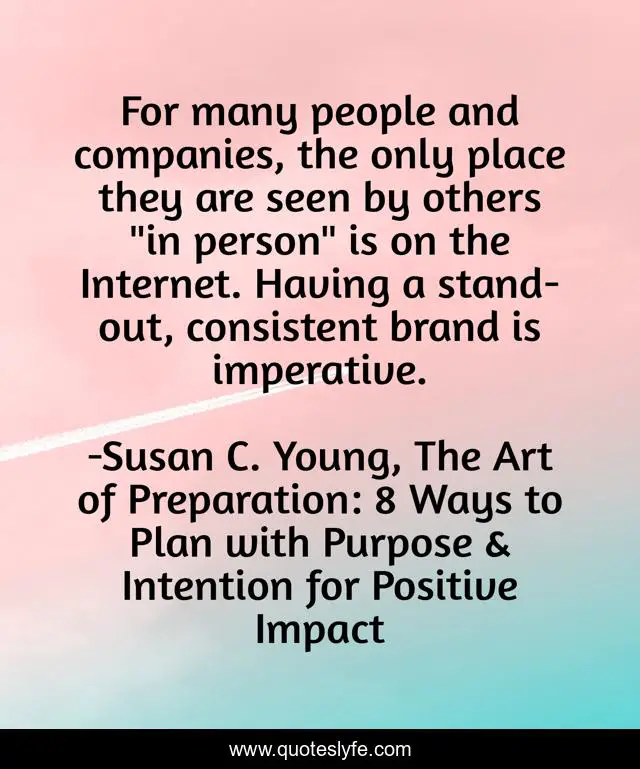 This page presents the quote "For many people and companies, the only place they are seen by others "in person" is on the Internet. Having a stand-out, consistent brand is imperative.". Author of this quote is Susan C. Young, The Art of Preparation: 8 Ways to Plan with Purpose & Intention for Positive Impact. This quote is about success, relationship, communication-skills, branding, attitude, behaviour, quotes-by-susan-c-young, susan-young, motivational-speaker,.