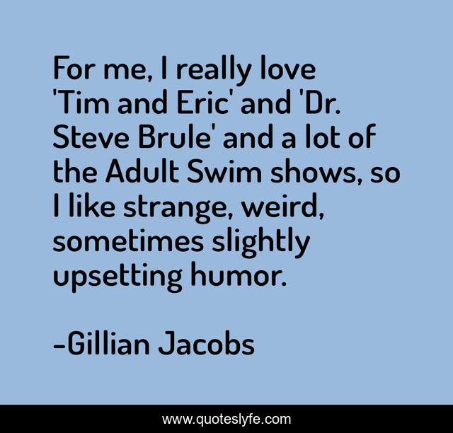 This page presents the quote "For me, I really love 'Tim and Eric' and 'Dr. Steve Brule' and a lot of the Adult Swim shows, so I like strange, weird, sometimes slightly upsetting humor.". Author of this quote is Gillian Jacobs. This quote is about me, weird, love, affection,.