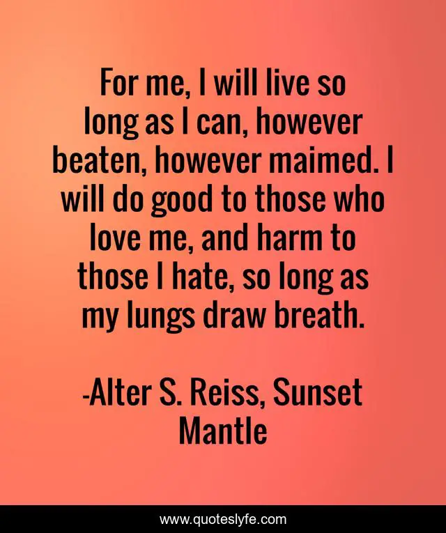 This page presents the quote "For me, I will live so long as I can, however beaten, however maimed. I will do good to those who love me, and harm to those I hate, so long as my lungs draw breath.". Author of this quote is Alter S. Reiss, Sunset Mantle. This quote is about life, death, hope,.