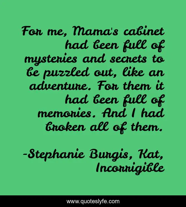 "Stephanie Burgis, Kat, Incorrigible Quotes." Quoteslyfe.com, 2025. Fri. 05 Dec. 2025. <https://www.quoteslyfe.com/quote/For-me-Mama-s-cabinet-had-been-164326>.