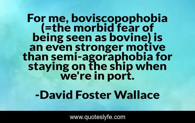 This page presents the quote "For me, boviscopophobia (=the morbid fear of being seen as bovine) is an even stronger motive than semi-agoraphobia for staying on the ship when we're in port.". Author of this quote is David Foster Wallace. This quote is about travel, phobias, humor,.