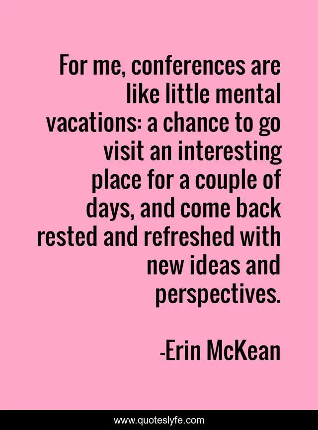 This page presents the quote "For me, conferences are like little mental vacations: a chance to go visit an interesting place for a couple of days, and come back rested and refreshed with new ideas and perspectives.". Author of this quote is Erin McKean. This quote is about me, place, ideas,.