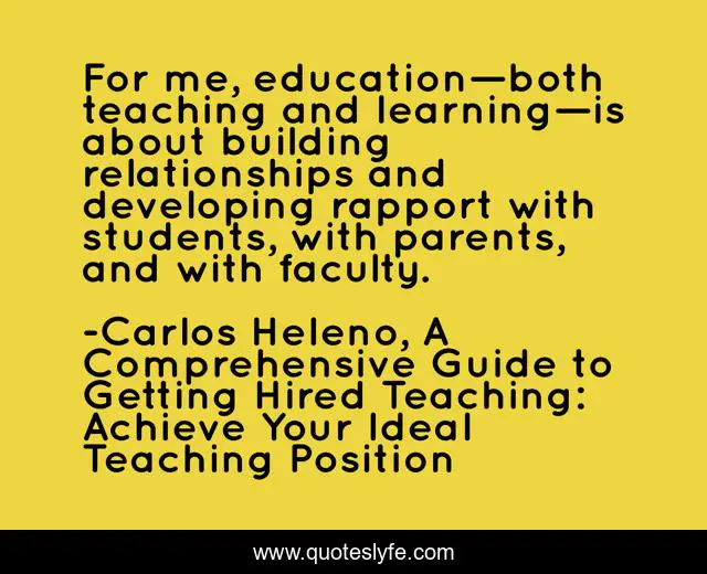 This page presents the quote "For me, education—both teaching and learning—is about building relationships and developing rapport with students, with parents, and with faculty.". Author of this quote is Carlos Heleno, A Comprehensive Guide to Getting Hired Teaching: Achieve Your Ideal Teaching Position. This quote is about students, teaching, education, learning,.