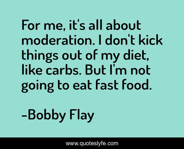 This page presents the quote "For me, it's all about moderation. I don't kick things out of my diet, like carbs. But I'm not going to eat fast food.". Author of this quote is Bobby Flay. This quote is about food, me, moderation,.