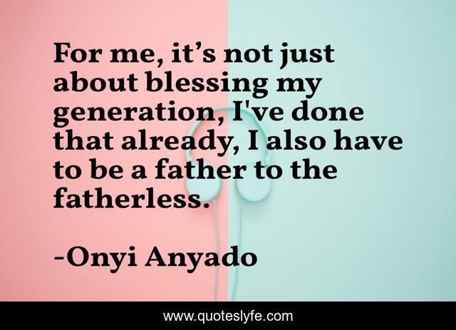 This page presents the quote "For me, it’s not just about blessing my generation, I've done that already, I also have to be a father to the fatherless.". Author of this quote is Onyi Anyado. This quote is about inspirational-attitude, fatherhood, generation, father, blessed, youth, blessings, generational, inspirational,.
