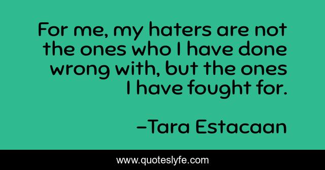 This page presents the quote "For me, my haters are not the ones who I have done wrong with, but the ones I have fought for.". Author of this quote is Tara Estacaan. This quote is about life, betrayal, sadness, human, haters, regrets,.
