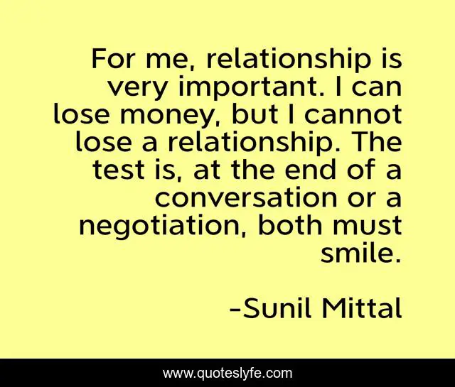 This page presents the quote "For me, relationship is very important. I can lose money, but I cannot lose a relationship. The test is, at the end of a conversation or a negotiation, both must smile.". Author of this quote is Sunil Mittal. This quote is about me, money, relationship,.