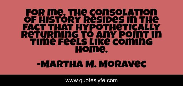 This page presents the quote "For me, the consolation of history resides in the fact that hypothetically returning to any point in time feels like coming home.". Author of this quote is Martha M. Moravec. This quote is about home, history,.
