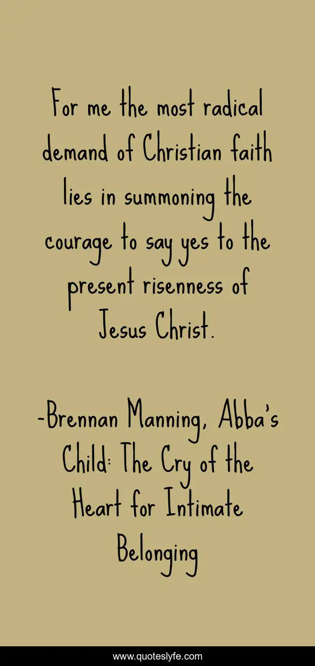 This page presents the quote "For me the most radical demand of Christian faith lies in summoning the courage to say yes to the present risenness of Jesus Christ.". Author of this quote is Brennan Manning, Abba's Child: The Cry of the Heart for Intimate Belonging. This quote is about faith, radical, jesus, courage, resurrection, christianity,.