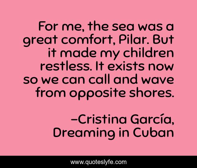 This page presents the quote "For me, the sea was a great comfort, Pilar. But it made my children restless. It exists now so we can call and wave from opposite shores.". Author of this quote is Cristina García, Dreaming in Cuban. This quote is about migrants, caribbean, family, cuba, travel, immigrants, ocean, sea,.
