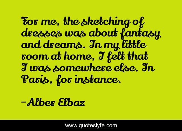 This page presents the quote "For me, the sketching of dresses was about fantasy and dreams. In my little room at home, I felt that I was somewhere else. In Paris, for instance.". Author of this quote is Alber Elbaz. This quote is about me, home, fantasy,.