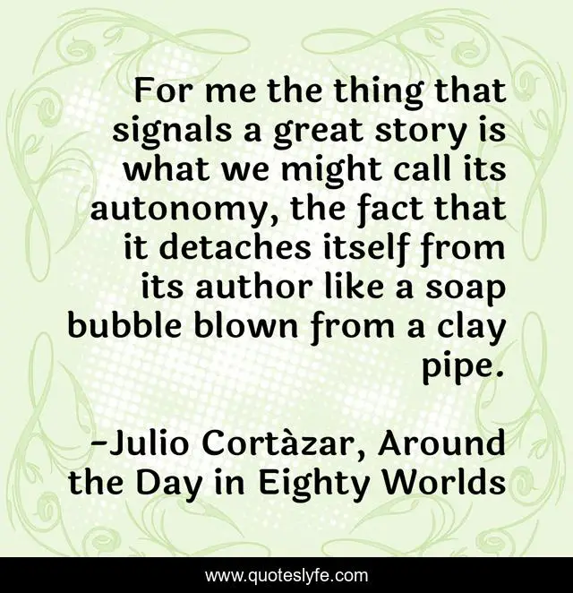 This page presents the quote "For me the thing that signals a great story is what we might call its autonomy, the fact that it detaches itself from its author like a soap bubble blown from a clay pipe.". Author of this quote is Julio Cortázar, Around the Day in Eighty Worlds. This quote is about story, writing,.