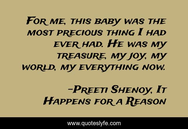 This page presents the quote "For me, this baby was the most precious thing I had ever had. He was my treasure, my joy, my world, my everything now.". Author of this quote is Preeti Shenoy, It Happens for a Reason. This quote is about motherhood, babies,.