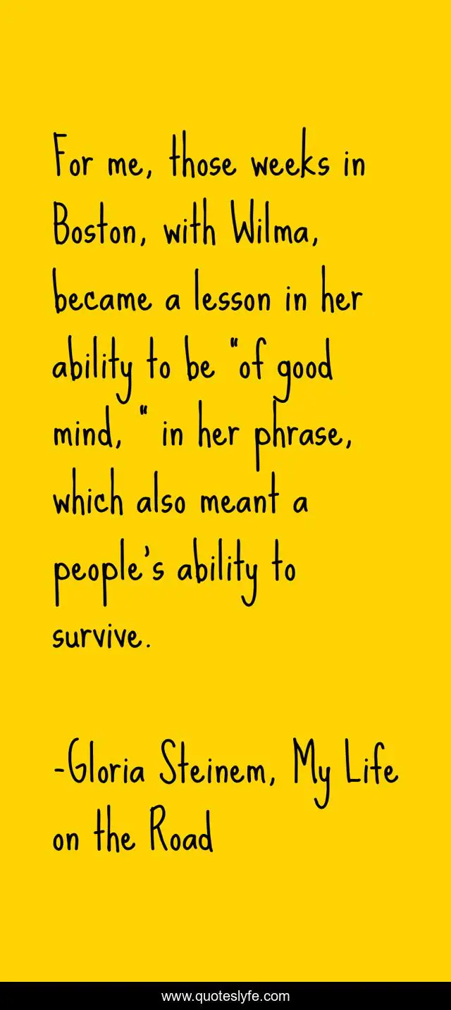 This page presents the quote "For me, those weeks in Boston, with Wilma, became a lesson in her ability to be “of good mind, ” in her phrase, which also meant a people’s ability to survive.". Author of this quote is Gloria Steinem, My Life on the Road. This quote is about perseverance, overcoming, surviving,.