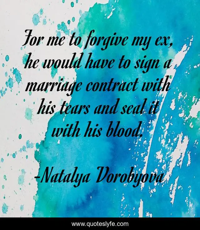 This page presents the quote "For me to forgive my ex, he would have to sign a marriage contract with his tears and seal it with his blood.". Author of this quote is Natalya Vorobyova. This quote is about relationship, humour, contract, sign, tears, marriage, blood, seal, silly,.