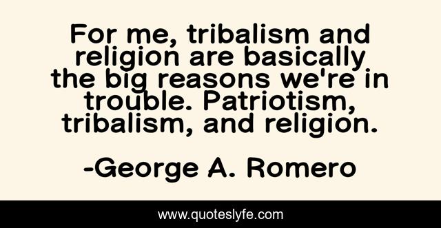 This page presents the quote "For me, tribalism and religion are basically the big reasons we're in trouble. Patriotism, tribalism, and religion.". Author of this quote is George A. Romero. This quote is about me, trouble, patriotism,.