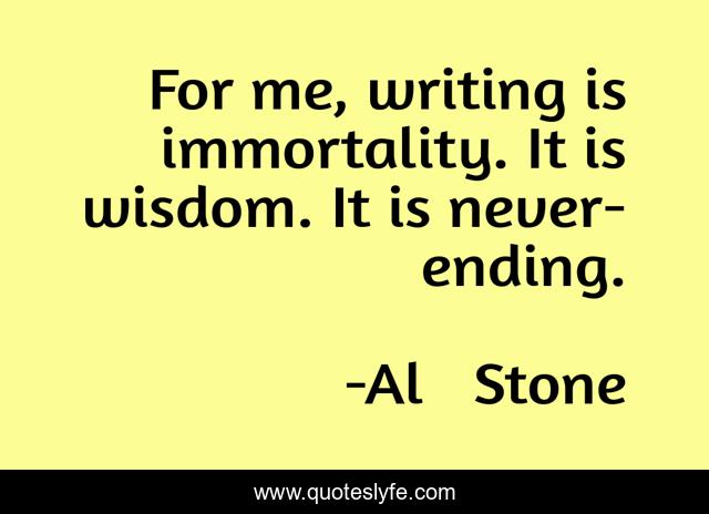 This page presents the quote "For me, writing is immortality. It is wisdom. It is never-ending.". Author of this quote is Al Stone. This quote is about enthusiasm, philosophy, inspirational, reality,.