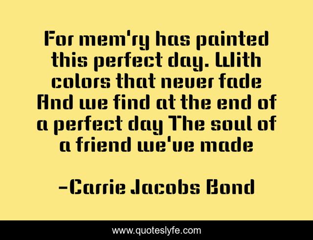 This page presents the quote "For mem'ry has painted this perfect day. With colors that never fade And we find at the end of a perfect day The soul of a friend we've made". Author of this quote is Carrie Jacobs Bond. .