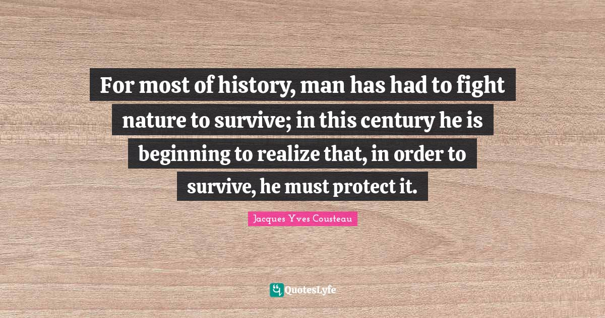 This page presents the quote "For most of history, man has had to fight nature to survive; in this century he is beginning to realize that, in order to survive, he must protect it.". Author of this quote is Jacques Yves Cousteau. This quote is about order, ocean, travel, protect, nature, history, century,.