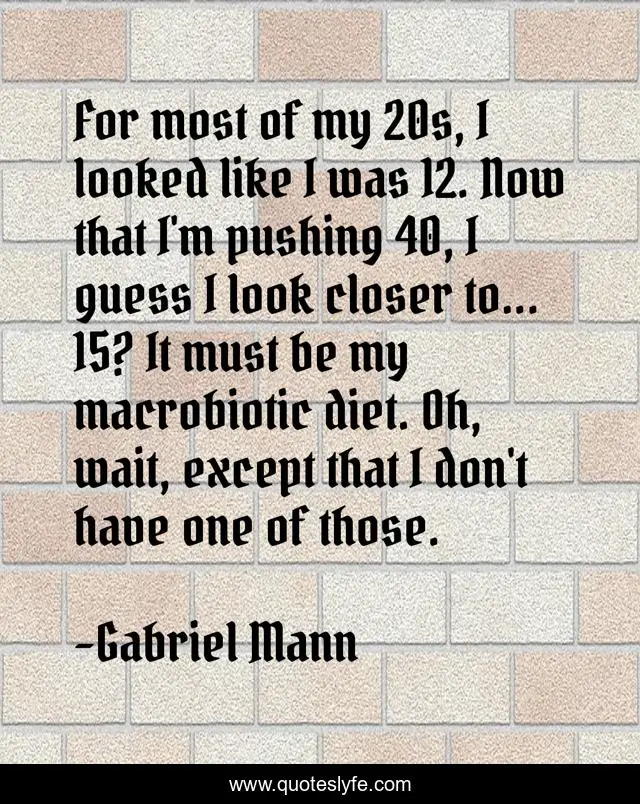This page presents the quote "For most of my 20s, I looked like I was 12. Now that I'm pushing 40, I guess I look closer to... 15? It must be my macrobiotic diet. Oh, wait, except that I don't have one of those.". Author of this quote is Gabriel Mann. This quote is about now, look, wait,.