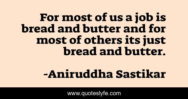 This page presents the quote "For most of us a job is bread and butter and for most of others its just bread and butter.". Author of this quote is Aniruddha Sastikar. This quote is about butter, job, bread,.
