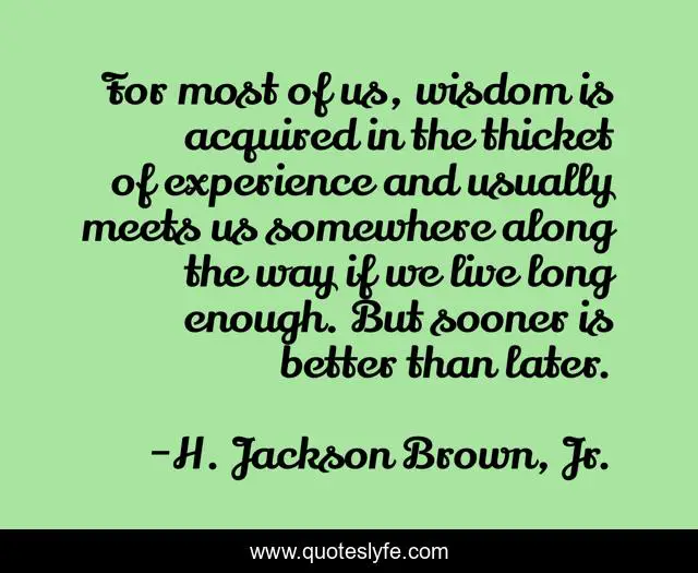 This page presents the quote "For most of us, wisdom is acquired in the thicket of experience and usually meets us somewhere along the way if we live long enough. But sooner is better than later.". Author of this quote is H. Jackson Brown, Jr.. This quote is about live, experience, long,.