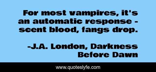 This page presents the quote "For most vampires, it's an automatic response - scent blood, fangs drop.". Author of this quote is J.A. London, Darkness Before Dawn. This quote is about funny, comedy, vampires, darkness-before-dawn,.
