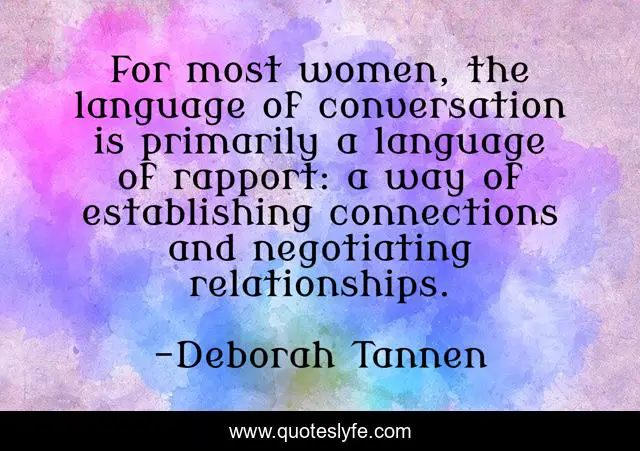 This page presents the quote "For most women, the language of conversation is primarily a language of rapport: a way of establishing connections and negotiating relationships.". Author of this quote is Deborah Tannen. This quote is about conversation, language,.