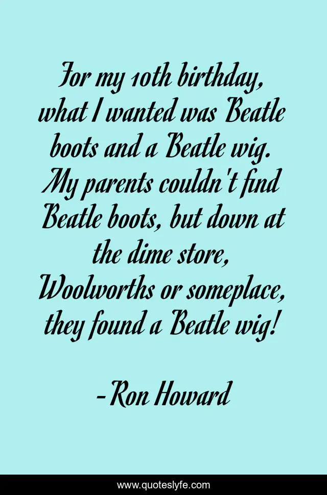 This page presents the quote "For my 10th birthday, what I wanted was Beatle boots and a Beatle wig. My parents couldn't find Beatle boots, but down at the dime store, Woolworths or someplace, they found a Beatle wig!". Author of this quote is Ron Howard. This quote is about down, parents, boots,.