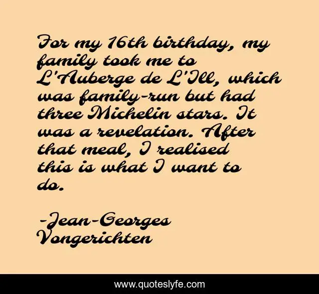 This page presents the quote "For my 16th birthday, my family took me to L'Auberge de L'Ill, which was family-run but had three Michelin stars. It was a revelation. After that meal, I realised this is what I want to do.". Author of this quote is Jean-Georges Vongerichten. This quote is about me, family, stars,.