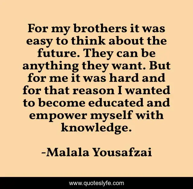 This page presents the quote "For my brothers it was easy to think about the future. They can be anything they want. But for me it was hard and for that reason I wanted to become educated and empower myself with knowledge.". Author of this quote is Malala Yousafzai. This quote is about me, myself, future,.