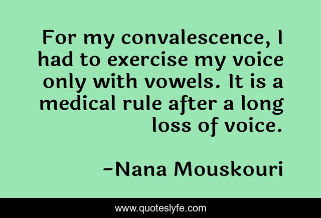 This page presents the quote "For my convalescence, I had to exercise my voice only with vowels. It is a medical rule after a long loss of voice.". Author of this quote is Nana Mouskouri. This quote is about loss, exercise, long,.