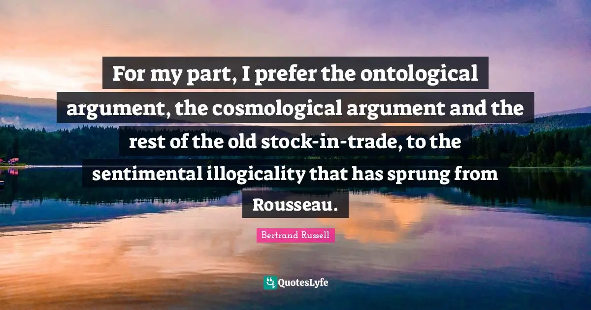 This page presents the quote "For my part, I prefer the ontological argument, the cosmological argument and the rest of the old stock-in-trade, to the sentimental illogicality that has sprung from Rousseau.". Author of this quote is Bertrand Russell. This quote is about god, reason, irrationality, rousseau,.